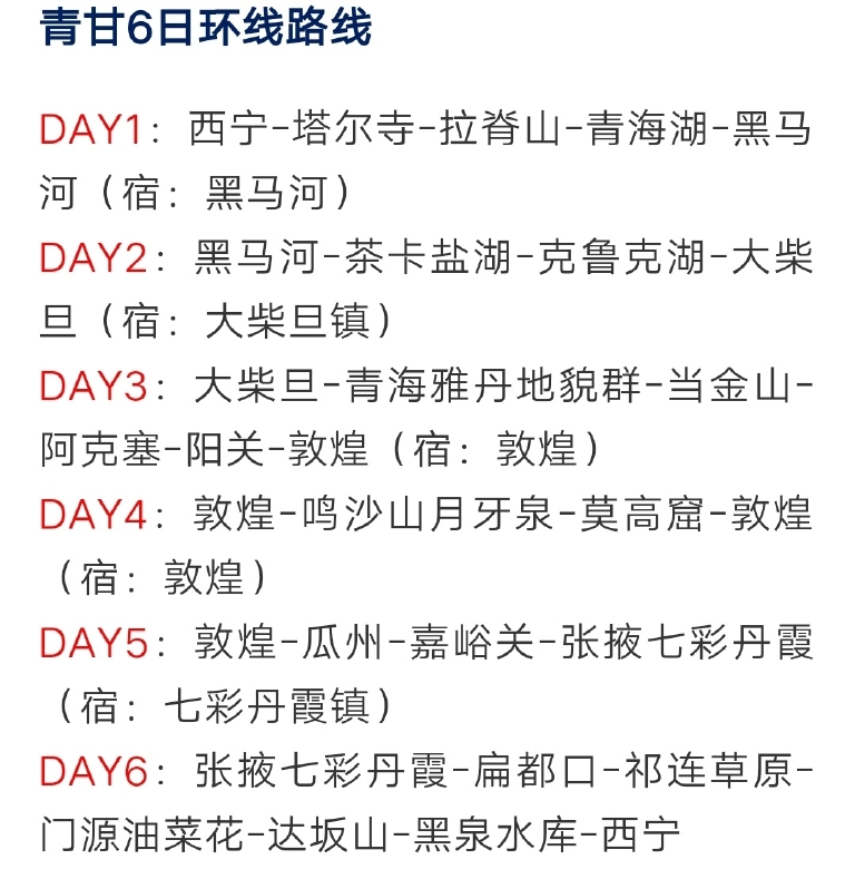 六日西宁之旅和我去时的时间正好吻合,把我的经历分享给你供参考,第一天贵德、塔尔寺,贵德是三江之源,水系发达,植被茂盛,号称西宁的后花园,到贵德先去黄河广场,乘游船游黄河,这里黄河水碧蓝碧蓝的,清澈见底,广场上有美食街,吃过中午饭去贵德国家地质公园,这里是丹霞地貌,非常值得游览。第二天市区,东关清真大寺、莫家街,主要是去莫家街品尝美食。第三天去拉脊山、青海湖,重点是青海湖,二郎剑、鸟岛、西海岸都逛逛,可租车骑行,晚上住黑马河,第四天早上看日出后去茶卡盐湖,这是世界上独一无二的,美的不得了。晚上还住黑马河。第五天祁连、卓尔山,要翻过海拔4120米的大冬树垭口,山上白雪皑皑,风光无限,卓尔山的风景也是独一无二的,晚上住宿祁连县城。第六天经过祁连大草原,返程。
