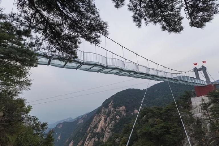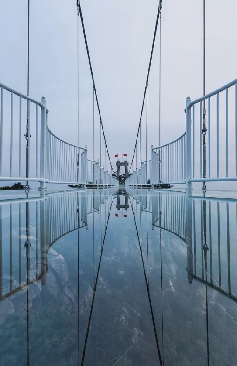 费县银座天蒙山世界第一人行玻璃桥开放,连接两座千米高山,全长505.5米,宽2.4米,桥面距谷底的垂直高度达到143米,在人行索桥跨中位置将更换60米玻璃桥面,桥悬于天际,人走在云中,峭壁峡谷尽现眼底,刺激到无法言喻。是世界上最长、跨度最大的人行玻璃悬索桥。