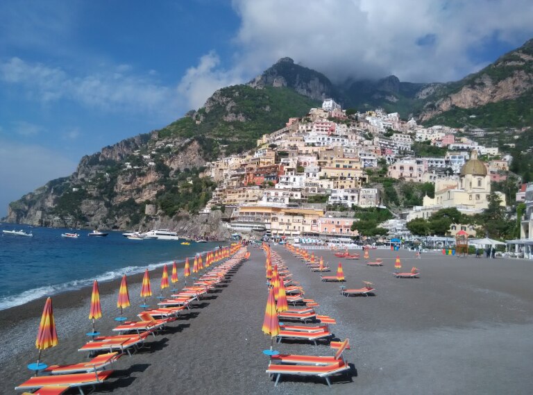 第四站:波西塔诺小镇(Positano),这是一个坐落在阿马尔菲海岸沿岸岩石上的童话小镇,小镇上的房子都盖在悬崖上,小巧而精致,五颜六色、鲜艳夺目,与湛蓝的海水、蔚蓝的天空和悠悠的白云相互印衬,鲜花星星点点的点缀着小镇。沙滩上排列着彩色遮阳伞、沙滩椅和游艇,海面飘着点点白帆,犹如珍珠般晶莹。你若想亲近大海,小码头上可以买到出海观鲸的船票。