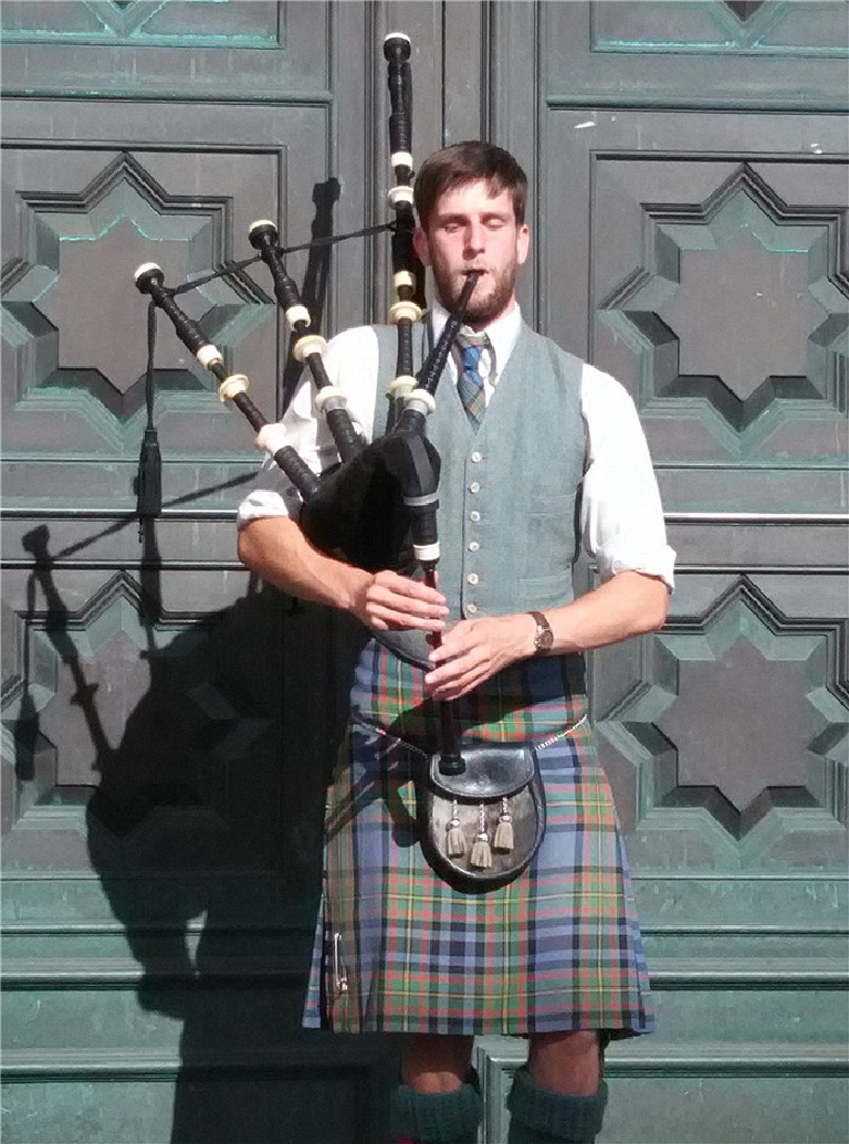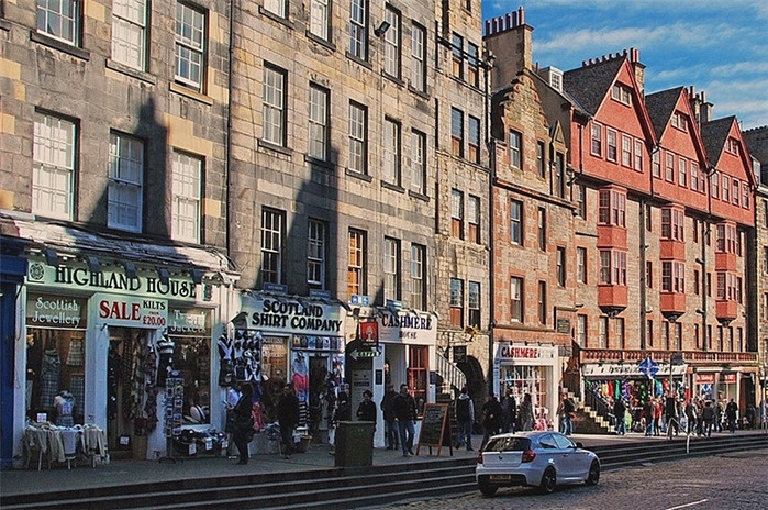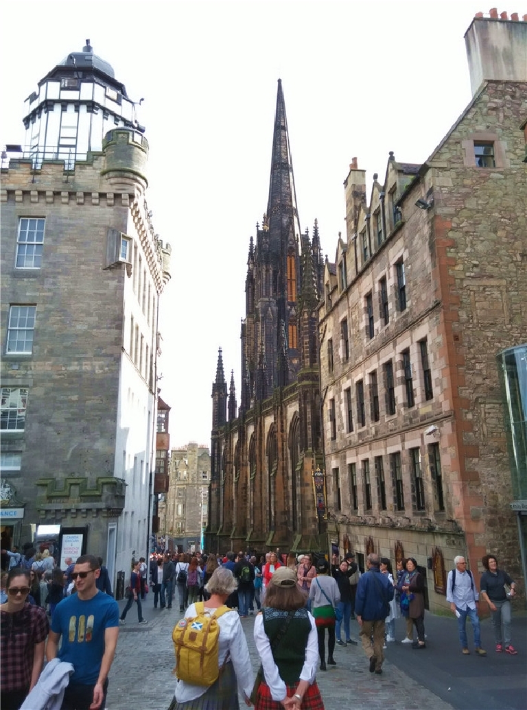 皇家一英里大道两旁小巷交错,石头铺成的地面早被磨得发亮,大道两边古老建筑古朴雄壮。漫步其中,宛如阅读苏格兰的古老历史。一英里大道上商店多,游客也多,熙熙攘攘,很热闹。谁不想买到正宗的苏格兰纯羊毛围巾,和品尝各种口味的威士忌呢!街道上有演奏风笛、魔术和行为艺术表演,使你仿佛穿越了时空,也分不清哪个是塑像哪个是艺术家了。