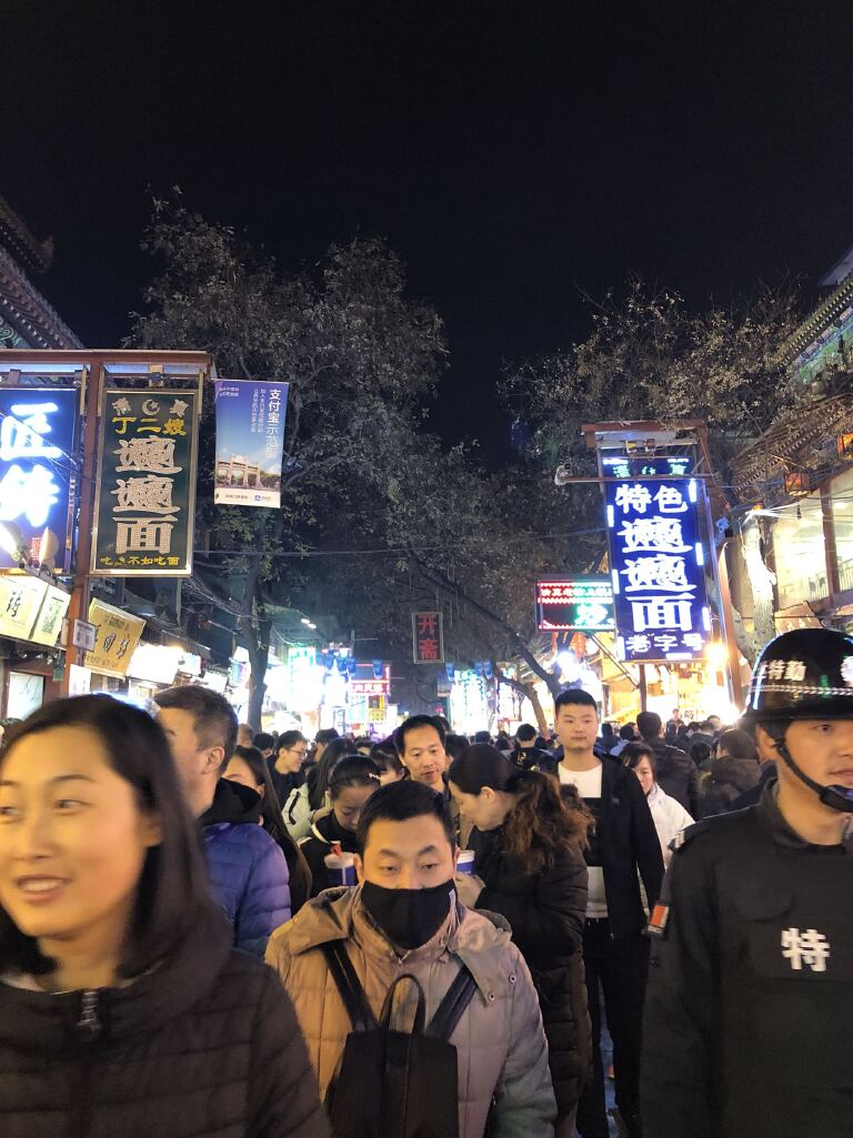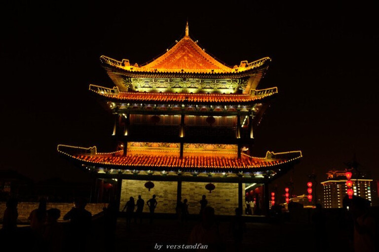 #钟鼓楼可以放在一起去,钟楼离回民街非常近,但是晚上简直挤不动,还有武警维持秩序,不准停下照相,只能往一个方向走。回民街门口有土特产商店,但是价格比较贵,想买的话可以往里面走,到西羊市左拐进入,有摊位卖的很便宜,但是东西也都一样。