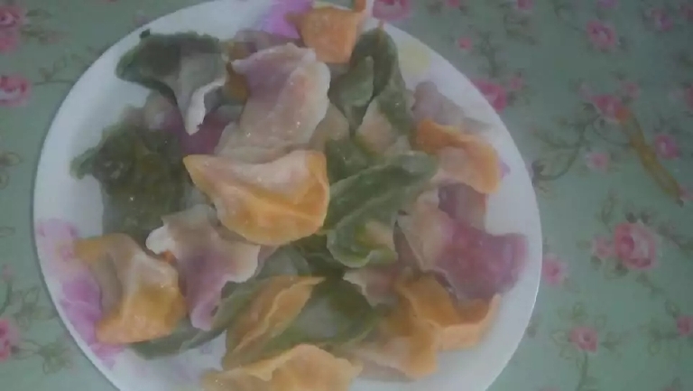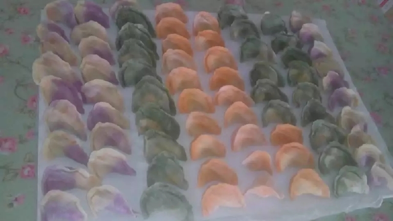 饺子面也有讲究,平时就是和白面的,过年我会用火龙果、菠菜、胡萝卜等的汁和面,包出的饺子更漂亮,也更营养!