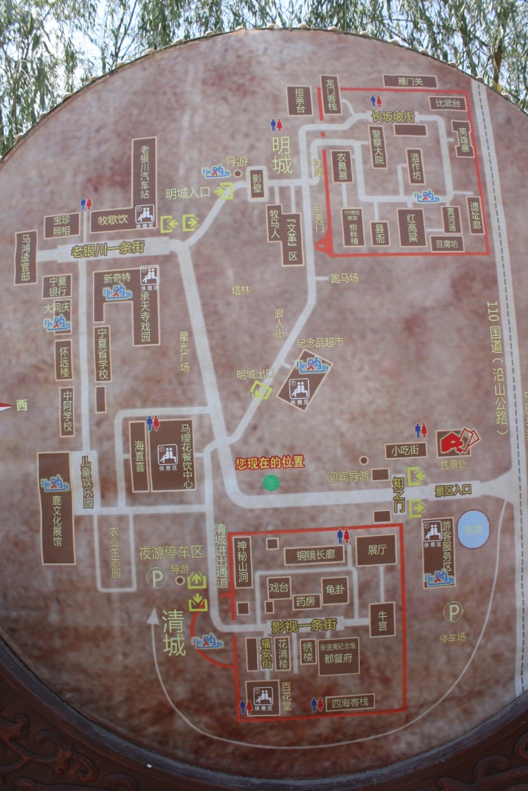 银川,景点有宁夏博物馆、鼓楼、南关清真大寺、西夏王陵、中华回乡文化园、镇北堡西部影城、贺兰山岩画、苏峪口森林公园、滚钟口、拜寺口双塔、海宝塔、水洞沟、黄沙古渡、鸣翠湖湿地公园等,也不要错过中亚之轴夜景,以及红山公园的日落。其中最值得一去的是影视城,中国三大影视城之一,西部唯一著名影视城,在此摄制影片之多,成就明星之多,获得影视大奖之多,皆为国内影视城之冠,被誉为“中国一绝”。影视城地处贺兰山东麓,距银川站25公里,银川城区35公里,在一个原始古堡的基础上修建而成,在明清时期是为防御外族入侵而设置的驻军要塞,不得不说,张贤亮先生的发现与创造,本身就是个不小的奇迹。景区分为清城、明城、老银川一条街三个区域,清城和明城一南一北,保留和复原了拍摄过影片的原景和道具,几步之遥,是另一个不同的电影呈现,似曾相识,勾起回忆,仿佛进入影片的情节中。对于电影迷而言,是种很大的满足,哪怕不那么喜欢电影,就着道具,来一下角色扮演,玩穿越,美拍,体会一把影视明星感,也是件趣事。那些熟悉的影片,如《红高粱》、《黄河绝恋》、《大话西游》、《新龙门客栈》、《火舞黄沙》、《乔家大院》、《新龙门客栈》、《锦衣卫》、《刺陵》、《东邪西毒》等,都可以在这里找到印痕,西部小镇题材的影片剧组为何青睐于它,亲临此地,你会明白原因所在,随着剧组不同影片的轮换,不同时段前去游玩的人,也许看到的是不一样的场景。
