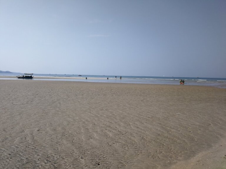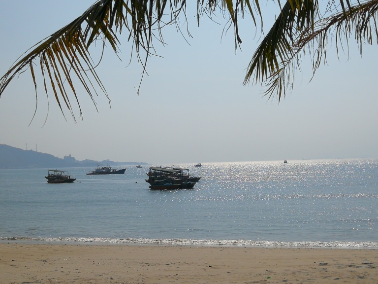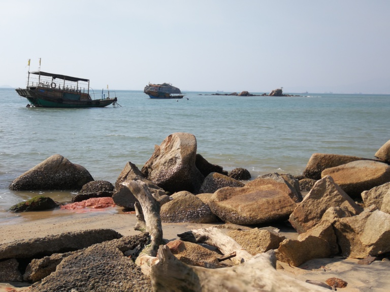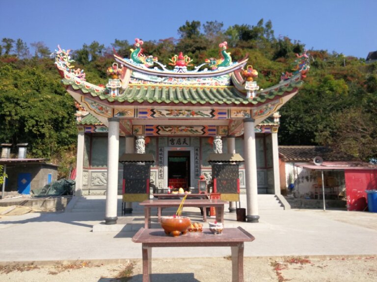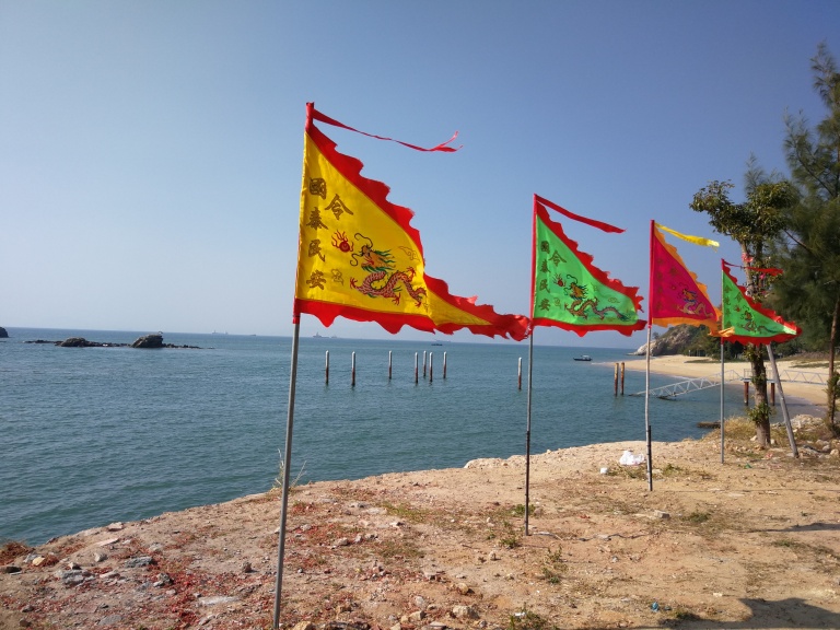 我们在巽寮湾避寒,不经意间发现了一处很美的小景。那次是走路去巽寮镇,发现岔路口写着通往天后宫牌子,我们就拐了进去。路走到头竟到了海边,是个也叫“天后宫”的渔船码头。第一眼看到的“二帝宫”,有点像土地庙,后面的妈祖庙才叫“天后宫”,哦,原来这里的妈祖庙都叫天后宫。当地的渔民在出海捕鱼要在启航前先祭妈祖,祈求保佑顺风和平安。妈祖庙前满地鞭炮碎纸,一定是刚举行了祭扫仪式(回来上网查了一下,这个地方原来叫“凤凰池”)。“凤凰池”妈祖庙修得精致小巧,色彩非常鲜艳。庙前的香案上摆放着供果香蜡,海边码头上彩旗飘扬。往前走来到了一处海滩,还有一座叫“凤池岛”的小岛,小岛依山傍海,风景秀丽怡人。海浪轻轻地涌向沙滩,这里的沙子细腻洁白晶莹,是巽寮湾最好的沙滩之一。海光山色朝夕辉映,让人流连忘返。