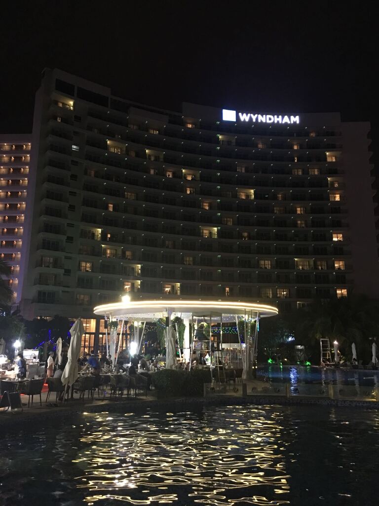 我住的温德姆酒店,带孩子一起去的,里面有儿童乐园,游泳池,酒店出门3/4百米就是天然沙滩,酒店里面的中餐厅也可以,定的套餐。