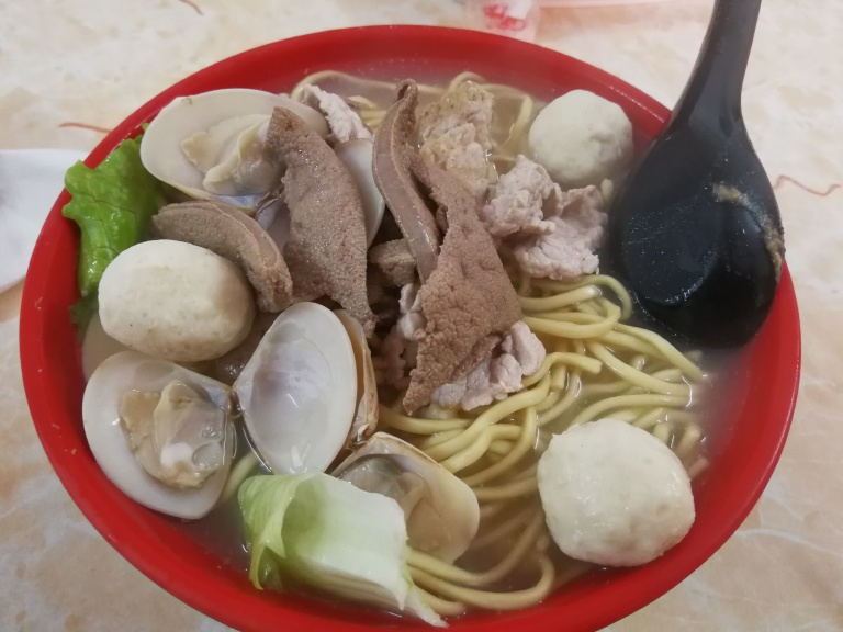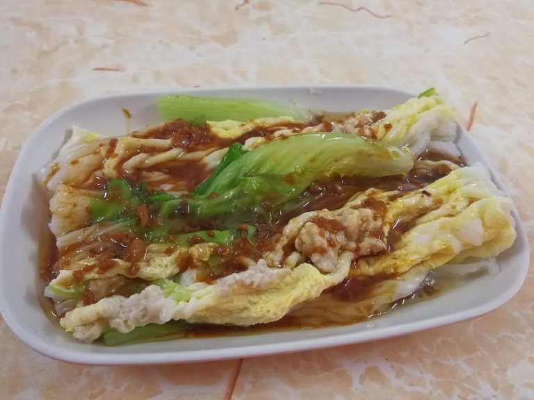 汕尾市传统小吃品种众多且家喻户晓、远近闻名,比如各种海鲜、牛肉饼、菜粿(菜包粿)、韭菜饺、冬节鸽、肠粉、层糕粿、菜茶、咸茶、扁食等等。汕尾不是热点旅游城市,游客不是很多,吃的东西也便宜。我们老两口一人要了碗海鲜面,又合伙吃了一盘肠粉,一共才用了三十多块钱就吃饱了。
