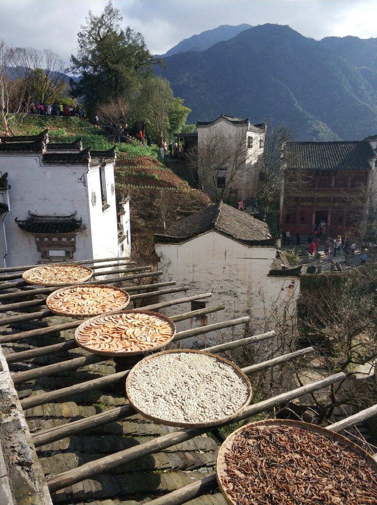 在篁岭村还有一个不能轻易错过的“奇景”,那就是“晒秋”民俗。生活在山区里的村民,由于地势复杂,平地极少,只好利用村子里房前屋后及自家窗台、屋顶架晒或挂晒农作物,久而久之,演变成了一种传统的民俗现象。