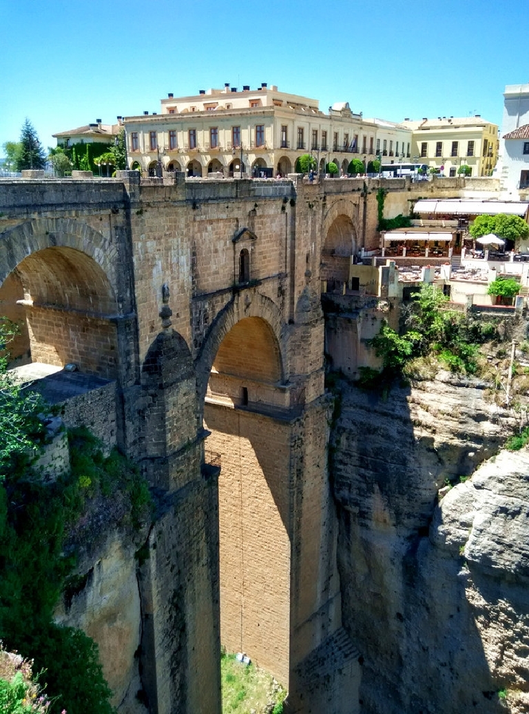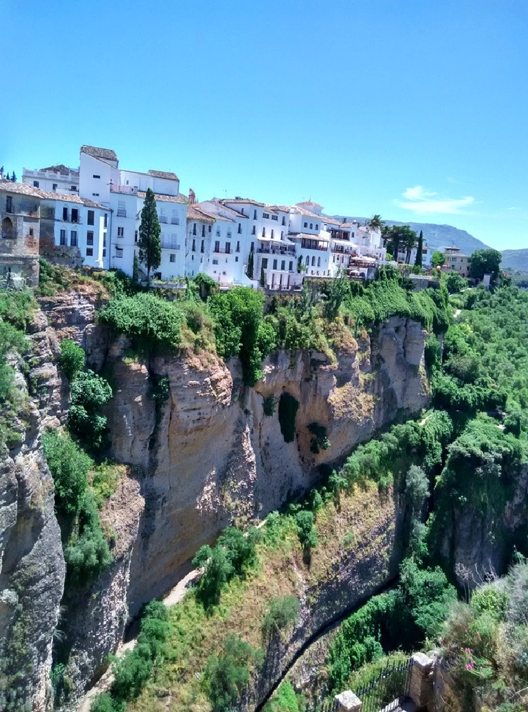 三千多年前,一批旅人风尘仆仆地爬上这座七百五十公尺的峭壁,发现这里地势险要,河流丰沛,食物丰美,于是安营扎寨,造出了第一座房子......。这白色的房子如同一颗白色的种子,随后,剧院、教堂、街道依次蔓延整个山坡,最终长为一座至今繁荣的小城。这个伫立在悬崖之上小城,给人一种惊心动魄的壮美之感。它被赐与过无数种名称:“建在云端的城市”,“悬崖边的白色小镇”,“全世界最适合私奔的地方”……同时这里也是西班牙斗牛士的故乡。小城安宁、质朴,仿佛是从周围的山崖之中自然而然生长出来的。小城的美在于冷峻的悬崖峭壁结合柔美的西班牙小镇风情,隐约里透出西班牙斗牛士豪迈的野性,与其人迹罕至空谷幽鸣的私密特征,都与浪漫相干;与恋人相拥在白色小城安静街巷散步,偶然让快门在木窗白墙下的绿草繁花间留下彼此相爱的记忆,这种想像中的场景让无论私奔与否的眷侣们都向往不已。
