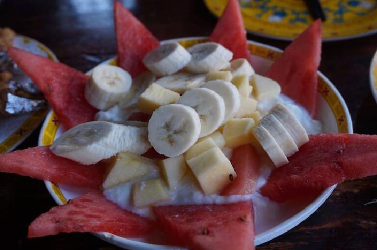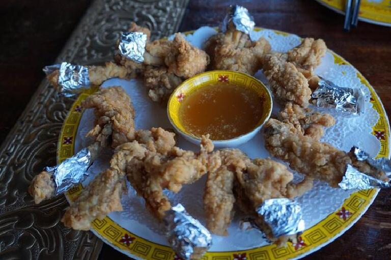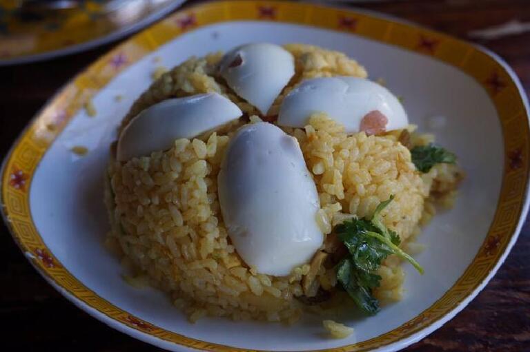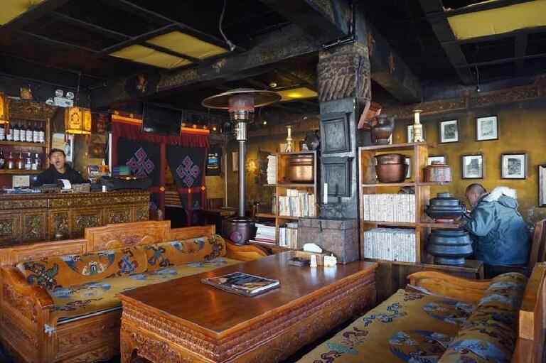 玛吉阿米是拉萨最为有名的藏餐厅,不过我觉得这家餐厅的确是名气大,但是味道一般了。玛吉阿米位于八廓街的东南角,去过的游客都说性价比不高,但是它有着非常浪漫的故事。现在的玛吉阿米餐厅是当年仓央嘉措和玛吉阿米幽会的地方,仓央嘉措是西藏历史上的一位杰出的领袖,也是一位浪漫主义诗人,而玛吉阿米就是仓央嘉措的梦中情人。餐厅的外观是一间土黄色的小楼,一楼并不是餐厅,二楼、三楼才是餐厅。餐厅内随处可以见的记事本,每本记事本的封面都会备注不同的城市,来这里的食客可以根据自己的城市,在记事本上写上一些感悟、祝福等等,单单是欣赏其他游客所写的内容,就可以在这里坐上很久。甜茶是西藏的特色茶饮,甜茶的味道就是我们平时喝的奶茶的味道,口味要更淡一点,很多餐厅都是以“壶”来出售的,玛吉阿米也是如此,一壶甜茶的量非常大,大概有1.5升,两个人肯定是喝不完的,喝不完的甜茶也不要浪费,可以倒入随身携带的水壶里。比亚尼鸡肉炒饭,里面主要是鸡肉丁和葡萄干,饭上再放了1个切4份的熟鸡蛋,饭量还是满足的,有些偏东南亚口味,单份36元。喜马拉雅炸鸡,算是我比较喜欢的一道菜,外皮炸得挺脆的,吃起来也很方面,炸鸡本身就有香味,再蘸一些特制的酱,口感还是不错的,价格要52元。藏式烤蘑菇是很多餐厅的特色,玛吉阿米的藏式烤蘑菇上加了一些芝士粉和辣椒粉,香味比较重,但是烤蘑菇可能不是新鲜出炉的,有一点凉了,48元性价比蛮低。水果酸奶,主要由西瓜、香蕉、哈密瓜、酸奶组成,在没有去西藏之前,就对西藏的酸奶早有耳闻,西藏的酸奶要比我们平时喝的酸奶酸很多,事实真是如此,即便是和水果混吃,酸奶的酸味也是可以让我酸得头皮都皱起来。总体来说,玛吉阿米就如很多游客说的那样,性价比不高,大家去玛吉阿米,都是被它的故事所吸引。