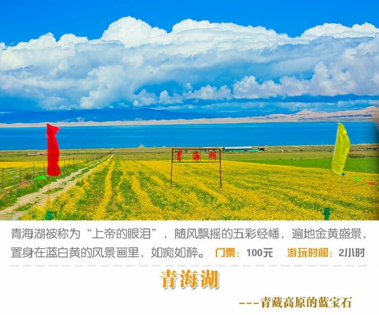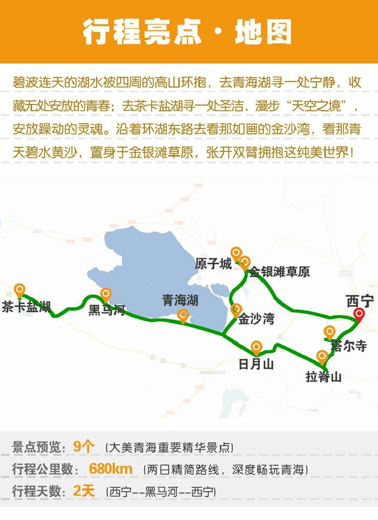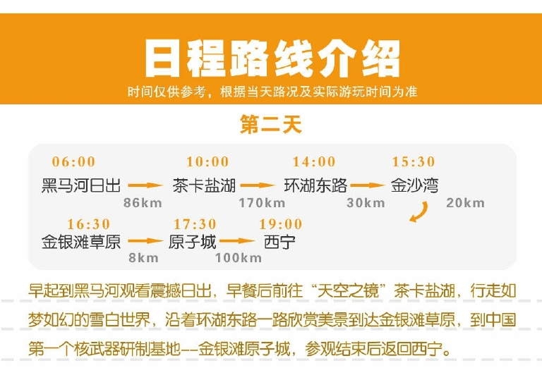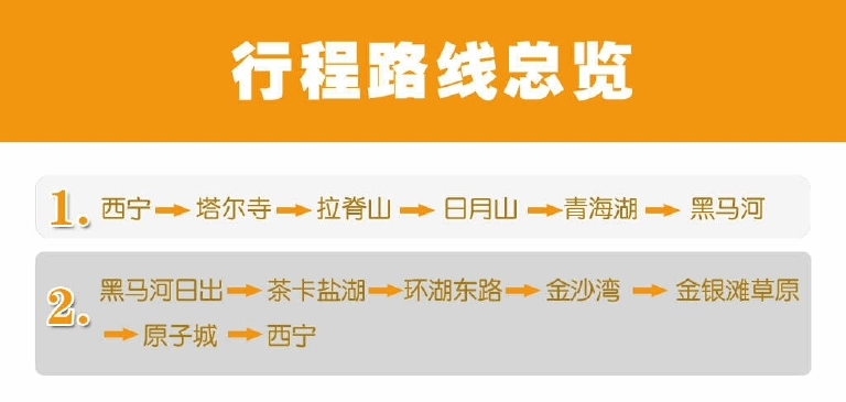第一天,塔尔寺,拉脊山,日月山,青海湖,茶卡盐湖(夜宿)。第二天,茶卡盐湖,黑马河,环湖西路,沙岛,金银滩,原子城,西宁!