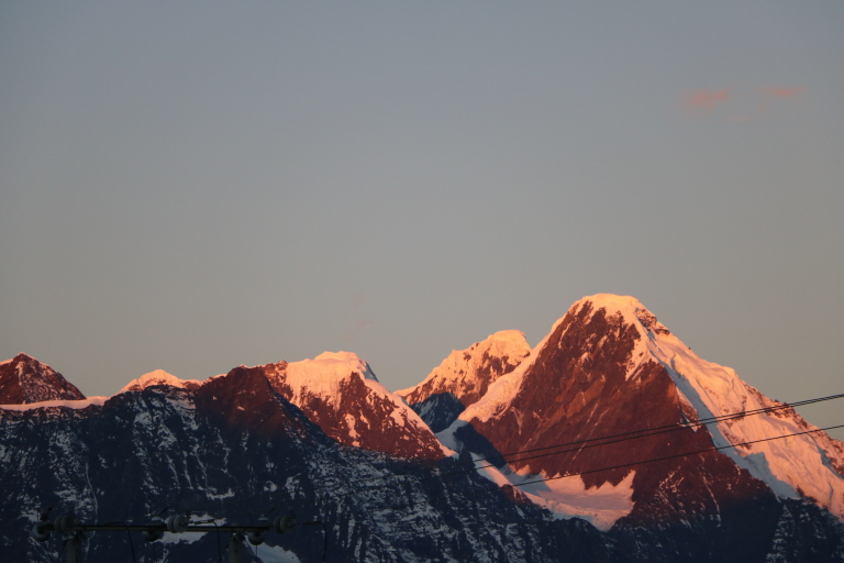 雪朗峰四周有无数座雄伟的山峰,极目远眺就能看到也在这片群山之中的艾格峰(Eiger3970m)、莫希峰(Mönch4099m)与少女峰(Jungfraujoch,4158m)。