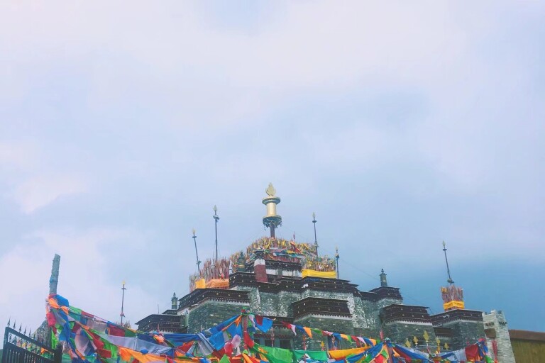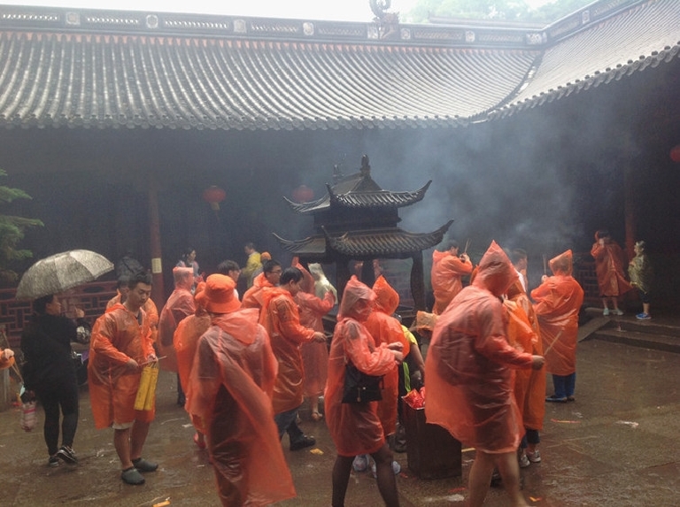 红色的雨衣给寺庙增添了一道美丽的风景线。