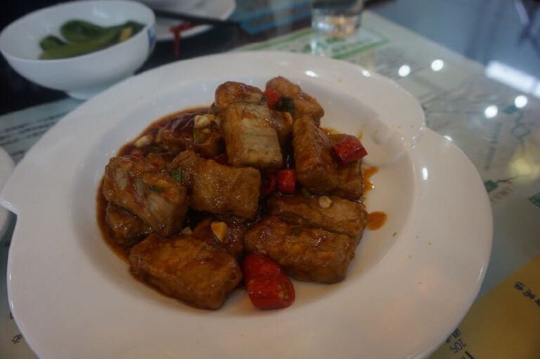 其次,毛豆腐是黄山地区有名的传统菜肴,长着白色绒毛的毛豆腐在加工后还是很美味的。毛豆腐的制作也是选用了经过挑选的粒粒饱满的黄豆,并采用了深山的山泉水,人工发酵而成,富含氨基酸等营养。加入了酸豆角、黄豆和辣椒的毛豆腐,在鲜嫩的口感上丰富了淡淡的酸辣香的口味。