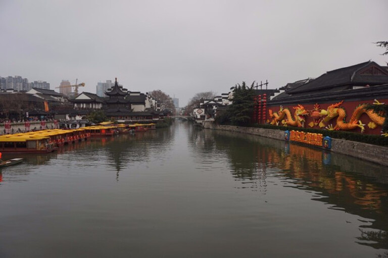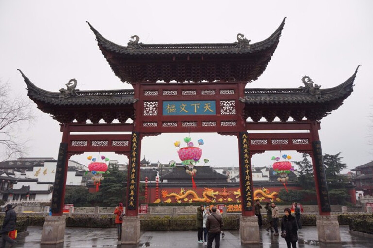夫子庙每天的游客人数都非常多,特别是夜晚的夫子庙,可以说是人山人海,如果想人少点的话,早晨7点的夫子庙游客数量非常少,虽然说早晨很多店铺都还没有营业,但是欣赏游客稀少时的夫子庙,也别有一番味道。我是春节去的,两边的店铺都还没有开门,看到的仅仅是空荡荡的走道,以及春节期间两侧高挂的灯笼。夫子庙大成殿的入口,大成殿要到早上9点才开放,但是在8点左右就已经有游客在这里排队了。早晨的秦淮河格外的宁静,欣赏到了江南园林,江南水乡的美。江南贡院码头,离秦淮河非常近,还能从侧面欣赏秦淮河上的文源桥。