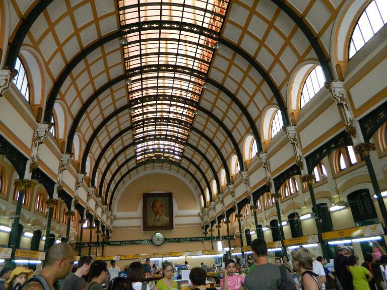 西贡邮局与红教堂一路之隔,这个老邮局建于十九世纪末,至今还在使用,并允许人们在里面尽情拍照,也可以坐在那里发呆或观赏大厅里的一切。很多旅游者在此都会买几张明信片寄给家人或朋友做为纪念。