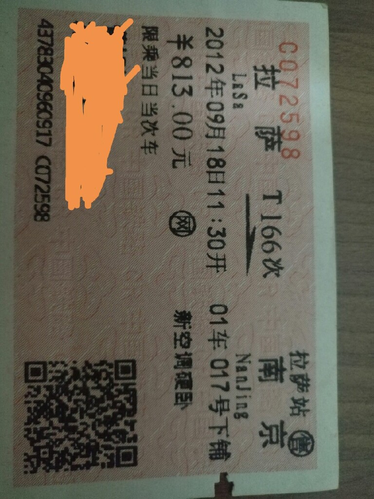 我坐火车时间最长的,要算2012年9月份从南京去拉萨了。当时我们一帮朋友,好不容易凑在了一起,因为当时票务紧张,多花钱买了上海开往拉萨的火车票,然后从南京站上车,历经将近五十个小时抵达拉萨。因为之前有同事去西藏玩过,坐的是飞机往返,高反很严重。我们这帮人,毫不犹豫的,选择了火车行。乘火车去西藏玩的优势十分突出,首先青藏铁路的海拔,随着列车的运行逐步攀升,有利于让我们的身体逐步适应高原环境,另一方面能够让我们体会到飞机旅游不能欣赏到的青藏线独有的自然景观,在火车上,我们欣赏到了长江的源头~~沱沱河,唐古拉山口,清水河大桥,神秘的无人区以不及太容易见到的藏羚羊等青藏线独有的风光。西藏旅游回来后,由于自己没有及时将照片导出,接着又去玩庐山,不巧相机又丢失,真可惜了我拍的那些照片了。好在,我有将火车票保存下来。否则……