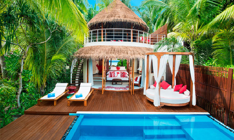 都喜天阙岛位于芭环礁(Baa Atoll)的Mudhoo岛(马尔代夫首个通过联合国教科文组织认定的生物圈保护区),被细软的白色沙滩、美丽的珊瑚礁和绿松石泻湖所环绕。靠近hanifaru huruu的潜水处,是观赏水下世界的最佳地点。从首都马累坐水上飞机仅需35分钟即可到达,珊瑚多,浮潜环境好,A级浮潜地。