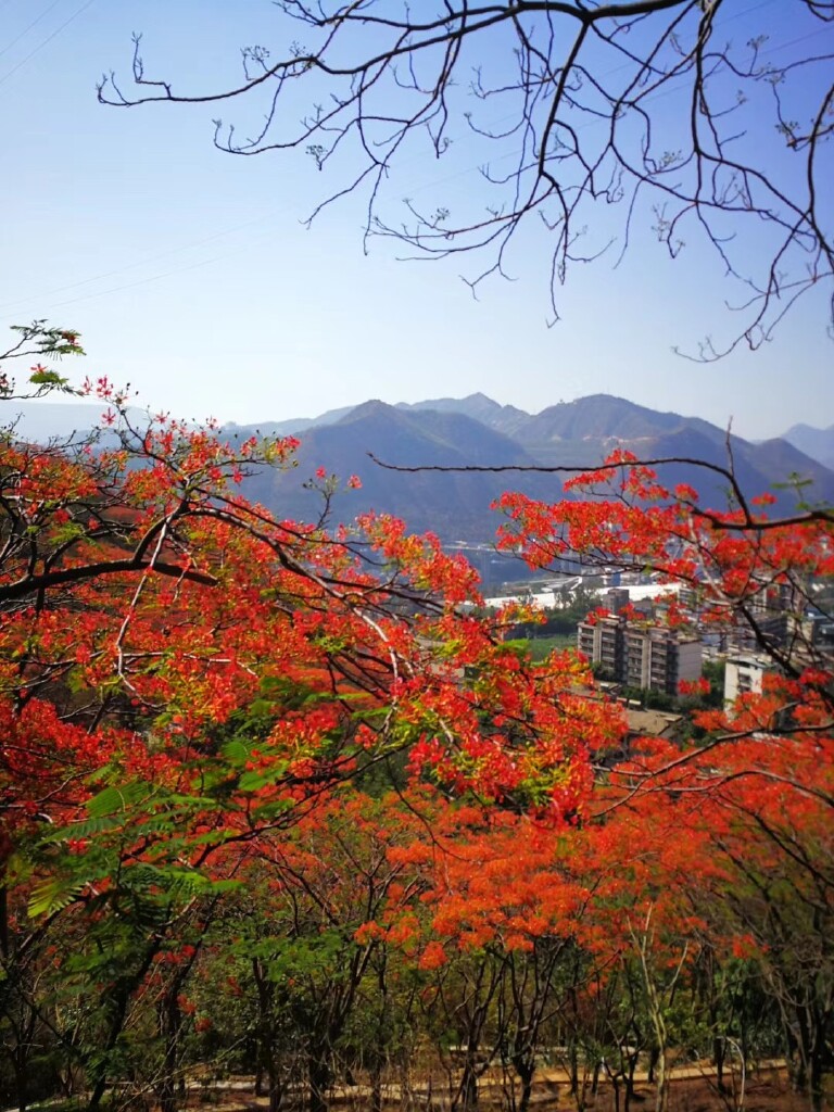 凤凰公园位于攀枝花市东区枣子坪街道大地湾社区,是一个以凤凰花为主题的公园。凤凰花公园占地约150余亩,园内共种植20000余株凤凰树,让我们看到了满山遍野那盛开的如烈焰般的凤凰花儿。那壮观的火红花海,如云似霞,是我看到过最美的花海!