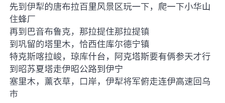 自驾前提,伊犁市出发走国防公路去昭苏看油菜花(约90公里),接着去特克斯游八卦城和喀拉峻草原,然后巩留县→新源县那拉提镇→217和218交叉口→唐古拉风景区→独库纪念碑→独山子。