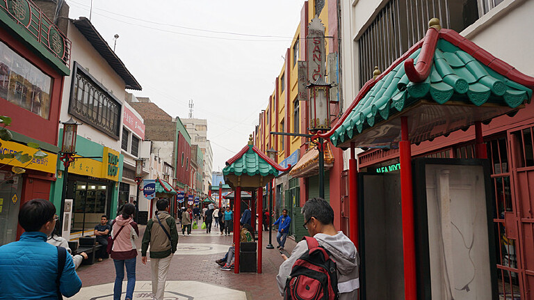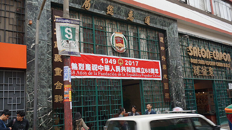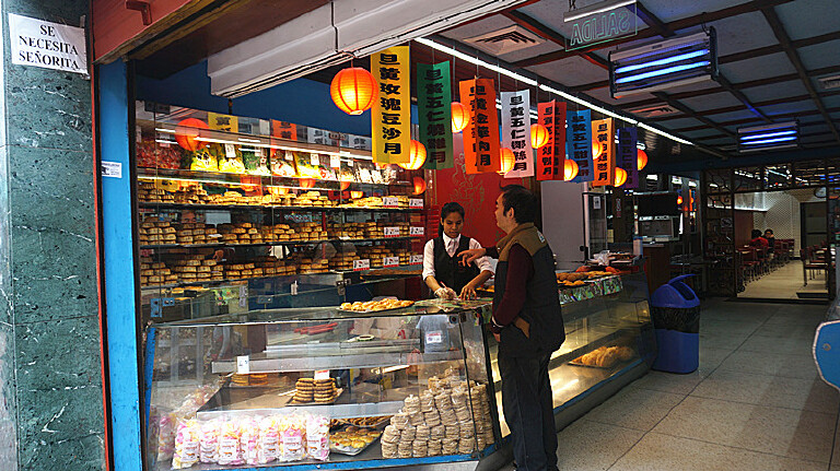 全世界的城市都有华人自己的“唐人街”,利马的唐人街是拉美最大的唐人街。今天利马是9月30号,而我们的祖国今天迎来了建国68周年的国庆日,在唐人街上可以看到庆祝国庆的大红标语。这家饼店挂了不少月饼名字的招牌:蛋黄玫瑰豆沙月、蛋黄金华肉月、蛋黄五仁椰丝月......,好熟悉,好诱人。