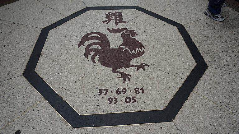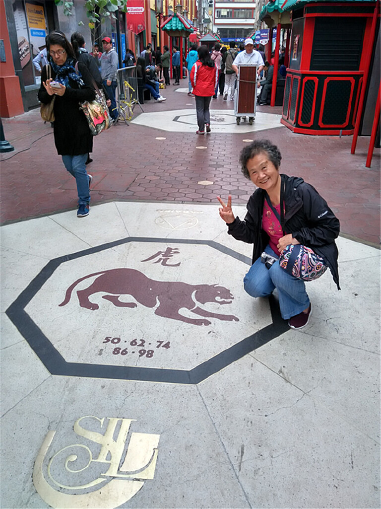 唐人街的地上画有十二生肖图案,最先找到的是女儿的生肖:鸡,又看到了猪的生肖,终于找到了我的生肖:虎。