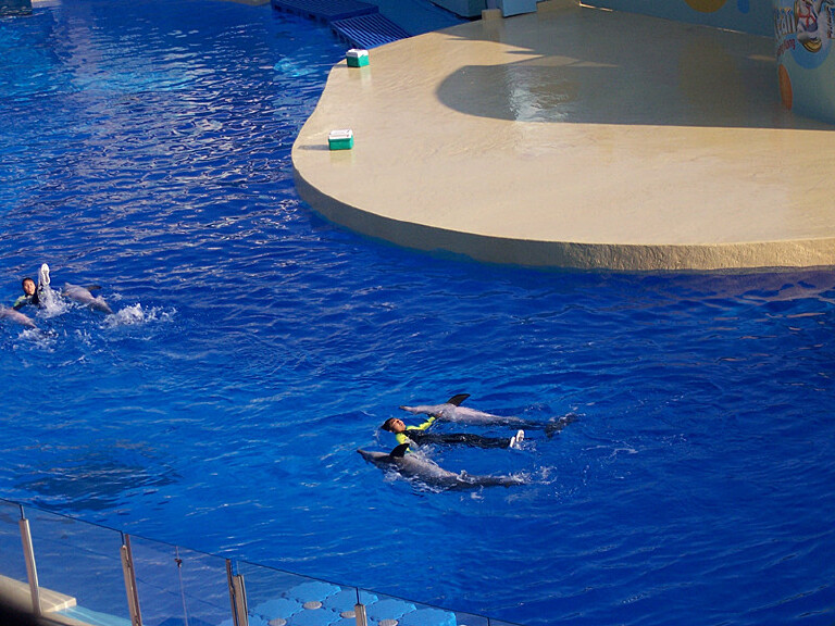海洋剧场位于山上中央,能容纳4000名观众,剧场中央是一个巨大水池,每天有加州海狮和瓶鼻海豚进行精彩表演。我们去得早,表演还没开始,在这里可以俯瞰山下的游乐场,高耸入云的海洋摩天塔,各式各样惊险刺激的机动游乐设施,如过山车、摩天轮、海盗船等。