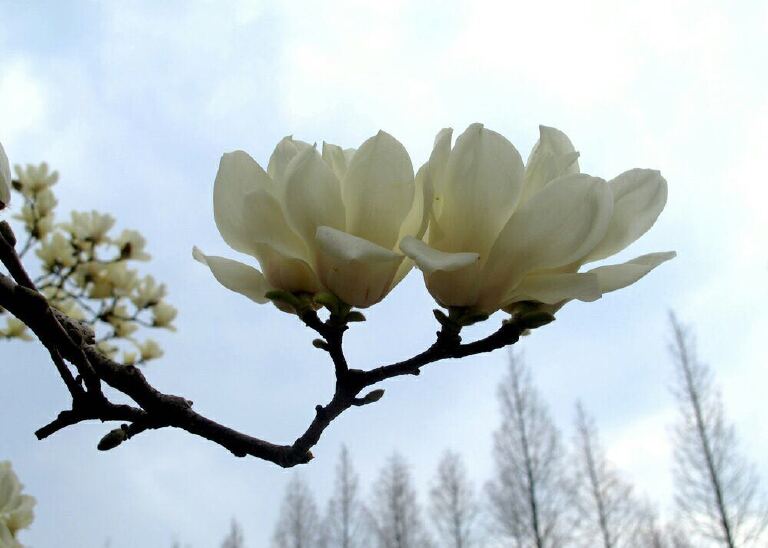 白玉兰花是一种刚毅坚韧的花,它的花蕾顶着大风,度过严寒的冬季,经过长时间的沉默,便于早春时节悄然开放。