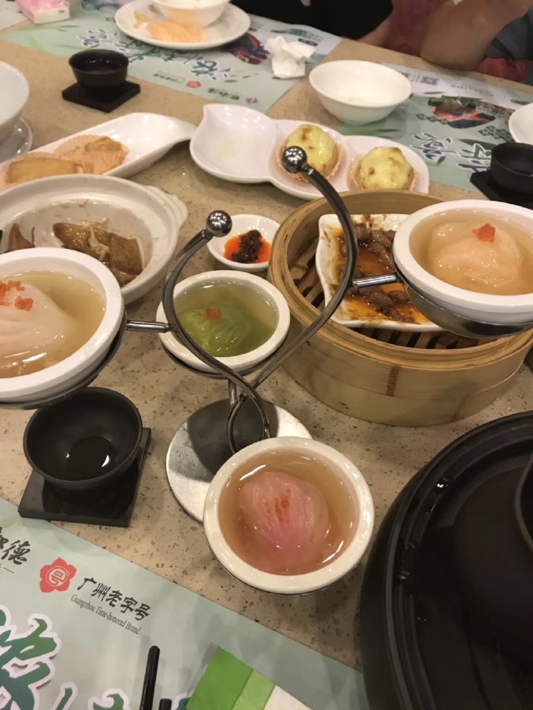 广州的美食品种非常多,所有粤菜类的美食在广州都能找到,例如烧腊、肠粉、云吞面、菠萝包、艇仔粥,很多很多。如要说到选择哪个餐厅,那我就推荐广州老字号点都德,这是广州非常有名的早茶餐厅,第一次来到广州的游客都会去品尝。点都德在广州有超过10家分店,每家分店的口碑都很好,人均80元左右。推荐的菜品有金沙红米肠、金牌鲜虾饺皇、酥化蛋挞、百合蒸酱凤爪、凤凰流沙包、香芒夹心椰汁糕。金牌鲜虾饺皇我比较推荐,据说是非物质文化遗产,确实非常好吃,外皮Q弹晶莹剔透,褶子也很整齐,最重要的是里面的虾球个大饱满,吃两个就饱了。酥化蛋挞一定要趁热吃,蛋香和奶香很浓,蛋挞很热乎,口感很松软,虽然不流心但是有种分分钟要流心的感觉。