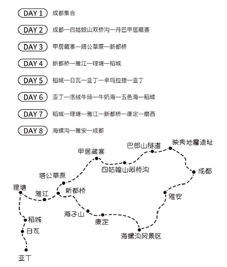 想象中7天的行程要翻过一座座海拔四千米以上的山峰,有不自信、有胆怯、有恐惧,但途中能邂逅无数多的美丽—那蓝天白云、高山草甸、牛羊成群,那长年冰雪覆盖着的四姑娘山、那号称摄影家天堂的新都桥、那风景如画的亚丁景区、那有着丰富冰川奇观的海螺沟……也许高原反应无法到达最美的目的地、也许高原反应无法收获全部美景,但鼓足勇气,因为一路的风景应该也足以满足了自己。