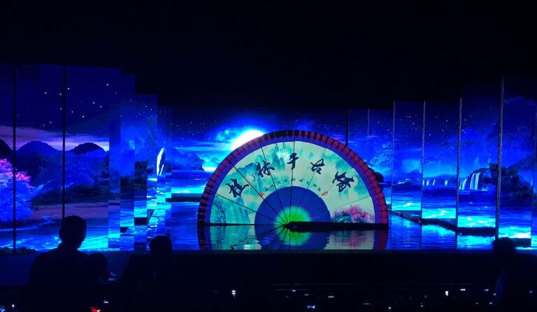 昨天刚去看了桂林的桂林千古情,桂林千古情是在今年7月27日对外开放的,才开放了1个多月,桂林千古情景区内定时会有表演,不过最亚洲的还是桂林千古情剧场的表演。我们看的是晚上8点的,表演时间为1个小时,桂林千古情演出分为5个章节,分别是《桂林传说》《大地飞歌》《千古灵渠》《漓江恋歌》《寻找刘三姐》,桂林传说是说彩叠山的故事,大地飞歌是说桂林烟雨的故事,千古灵渠是说开辟灵渠和一碗面的故事,漓江恋歌是讲述漓江山水画的故事,寻找刘三姐顾名思义就是讲述刘三姐的故事。整个表演运用了很多高科技技术,威亚、喷雾、升降低的转换、烟火和激光效果,每一章节结束,观众都会不由自主的起立鼓掌。
