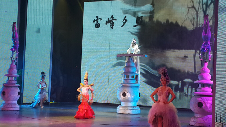 在杭州游玩时,在市区内的东坡大剧院欣赏了一场《西湖之夜》的演出。东坡大剧院是个比较标准的剧院,较之一些超大规模的演出,在东坡大剧院可以更近距离的观赏。整场演出以华美的开场、优美的唱腔、惊险的杂技,通过岳飞雄风、梁祝情缘、南宋盛景、东方佛光、风雅西湖等情节,以美丽的西湖历史为背景,经典舞台艺术与娱乐演出相结合,更有演出者与观赏者之间的互动,一个多小时的演出,使观者领略了西湖的人文风情和魅力。