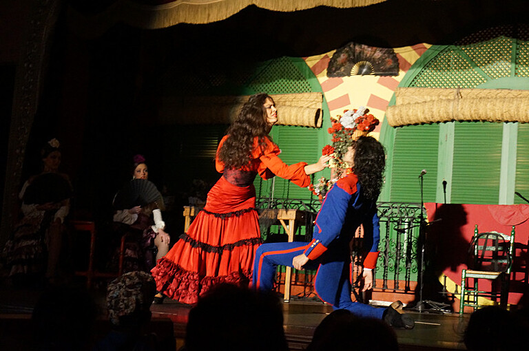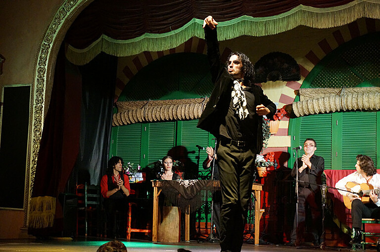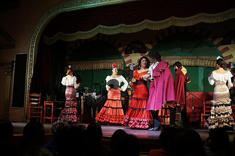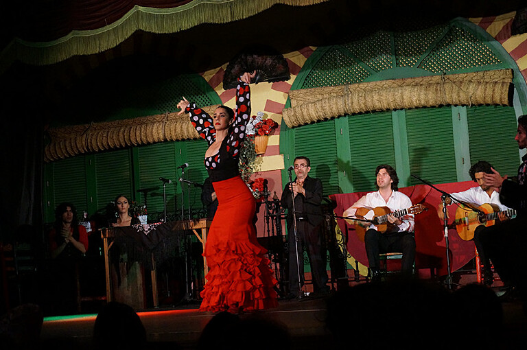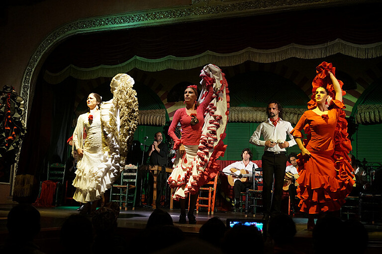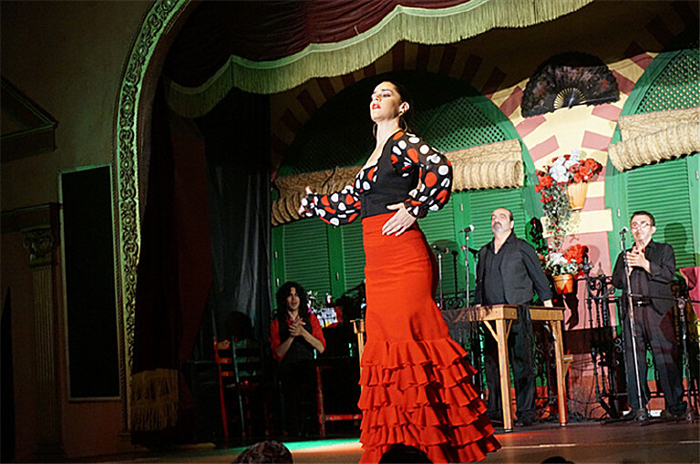 西班牙国粹弗拉明戈表演时,必须有吉它伴奏,并有专人在一旁伴唱。上场的男舞伴穿紧身黑裤子,长袖衬衫,有时还加一件饰花的马甲;女舞伴则把头发向后梳成光滑的发髻,穿艳丽的服装、紧身胸衣和多层饰边的裙子。