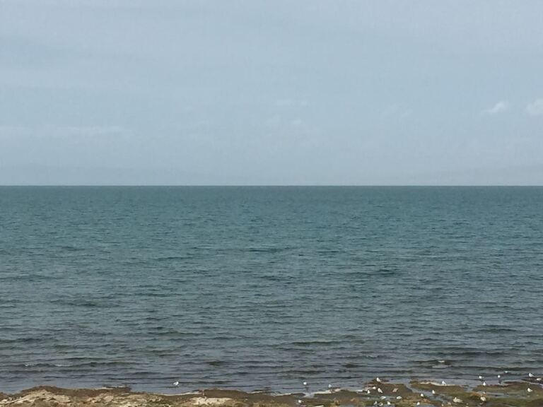 青海湖的四周被四座巍巍高山所环抱,举目环顾,犹如四幅高高的天然屏障,将青海湖紧紧环抱其中。从山下到湖畔,则是广袤平坦、苍茫无际的千里草原,而烟波浩淼、碧波连天的青海湖,就象是一盏巨大的翡翠玉盘平嵌在高山、草原之间,构成了一幅山、湖、草原相映成趣的壮美风光和绮丽景色。