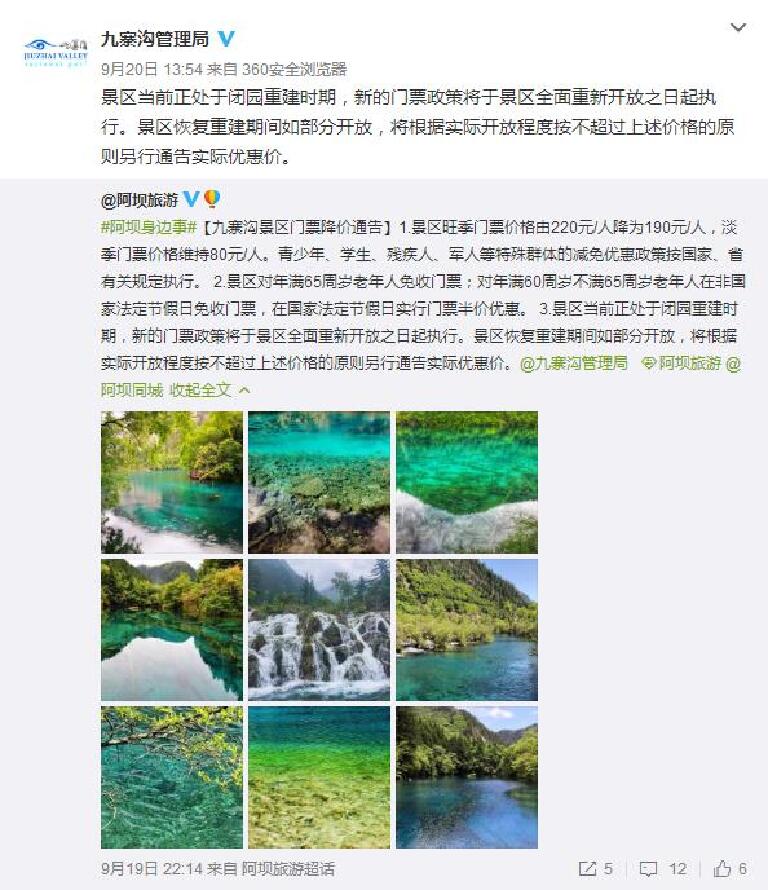 不过去年的地震后对九寨沟有非常严重的损毁,很多美景就这样消失了,真的是非常痛心!今年上半年有开放部分区域,不过只接待团队游客,而且每天限额两千人,但是今年6月下旬的时候有发公告说九寨沟景区暴发严重山洪泥石流灾害,为了安全起见,九寨沟从7月1日起采取临时性闭园措施,暂停接待游客,直到目前为止,景区都处于闭园重建时期。希望大灾大难以后能远离九寨沟,不要再让ta受伤了,也希望能早日重新开放,让大家能继续一睹九寨沟的美景!