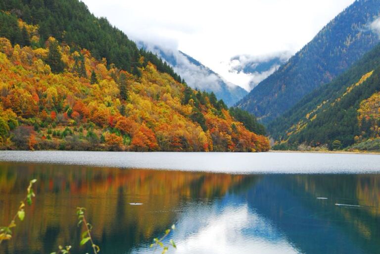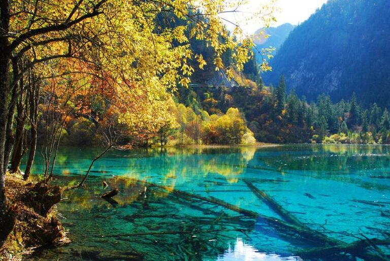 九寨沟一年四季都是漂亮的,然而九寨沟的深秋是最为绚烂多彩的,山坡上的树叶呈现出金黄、火红等颜色,倒映在大大小小的蓝绿海面上,更显得格外缤纷艳丽,此刻,游人仿佛进入了梦幻世界。