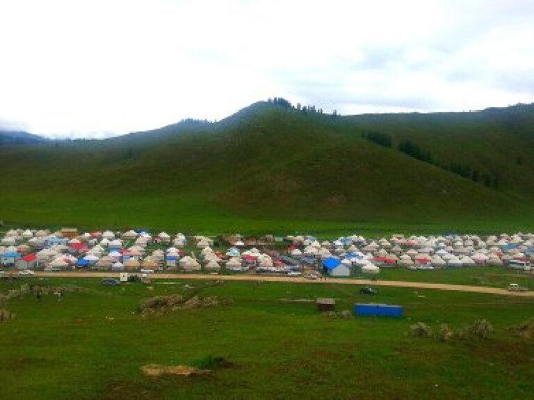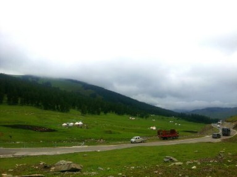 在北屯火车站出站口出来,对面有很多大客车、小客车和出租车,因为到这里只能选择公路交通了,我上了一辆发往哈巴河的车,途经布尔津,昨晚在火车上我预订了贾登峪一家哈萨克牧民开的毡房旅馆,贾登峪是去喀纳斯的必经之地,计划在那里住下来,休整一晚,第二天再进喀纳斯景区。从北屯到布尔津的客车票30元,到达布尔津用了将近两个小时。布尔津是一个边疆小城,这里的交通不是那么便利了,客车停车的地点在布尔津汽车站,到售票处咨询,已经没有发往贾登峪的班车了,虽然此刻还没到11点钟。在客车站外面,到是有一些出租车,师傅们都很热情,问到哪里,包不包车,班车少,给他们提供了赚钱的机会,包车价格相对较贵,幸运的是在车站门口遇到来自巴音布鲁克的一位教授带着爱人和女儿也要去喀纳斯,于是我和他们拼了一个车,每个人60元,三个多小时到达贾登峪,布尔津到贾登峪130多公里,正常也就两个多小时,师傅为了节省费用绕了一段路,时间稍长了些。