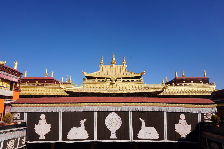 我去过的景点中,最被洗脑的就是拉萨的大昭寺,传说故事太多了。内部庭院的布置风格有些尼泊尔的风格。相传大昭寺是松赞干布为了尼泊尔的尺尊公主而建的。当年尺尊公主和文成公主下嫁到西藏,都是携带释迦摩尼亲手制作的佛祖等身像前往的,松赞干布迎娶这两位公主,主要是想扩大佛教在西藏那个的地位,与当时的西藏本教抗衡。尺尊公主带的是8岁的佛祖等身像,文成公主带的是12岁的佛祖等身像,文成公主在即将到达的时候,途径一个沼泽地,在沼泽地被困了很久,在嫁给松赞干布后,文成公主请求松赞干布在那块沼泽地上一座寺庙,并且把12岁的佛祖等身像供于寺庙中,即现在的小昭寺。尼泊尔的尺尊公主得知后,也向松赞干布提出建一处寺庙,供奉她带来的8岁的佛祖等身像,松赞干布知道文成公主精通天文地理,于是让文成公主选地址,文成公主发现西藏的地图犹如一个魔女,而魔女的心脏部位是一个湖泊,因此建议填湖建造寺庙,供奉8岁的佛祖等身像,但是填湖的进程很慢,白天填好,晚上一过又恢复原样,直到有人看到晚上几只山羊拖着石头来填湖,白天工人填,晚上山羊填,最终历经3年的时间,终于把湖给填了,“山羊填湖”由此而来,这也是大昭寺的顶部有着金羊顶的原因。