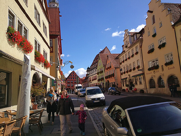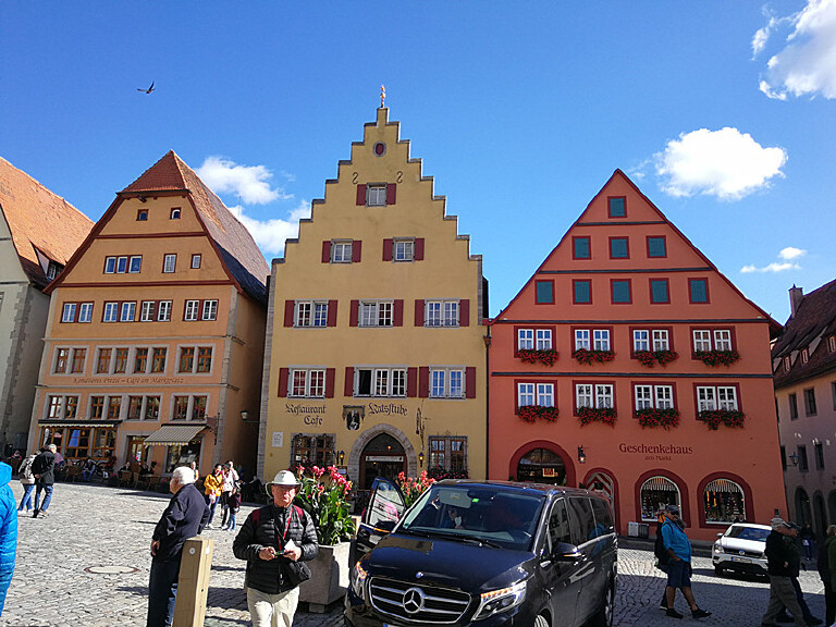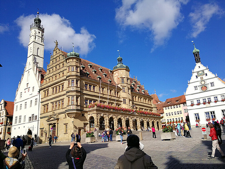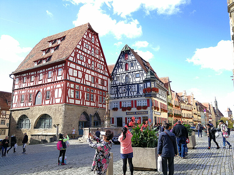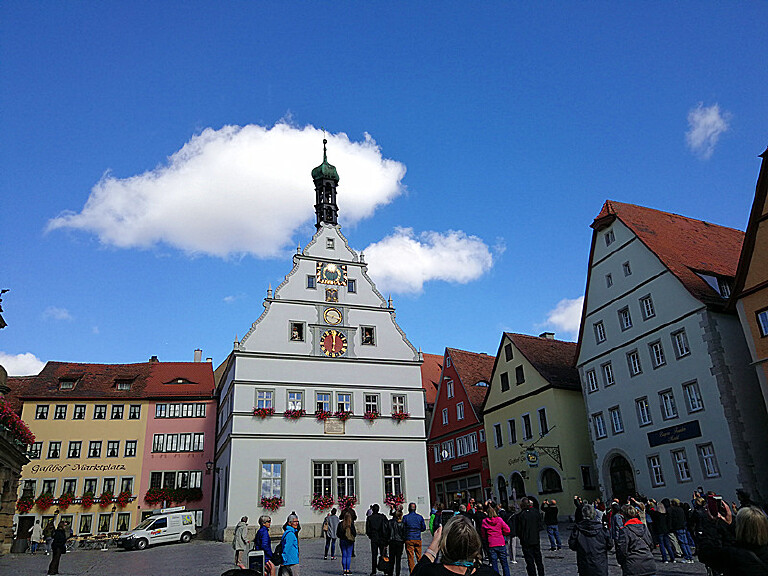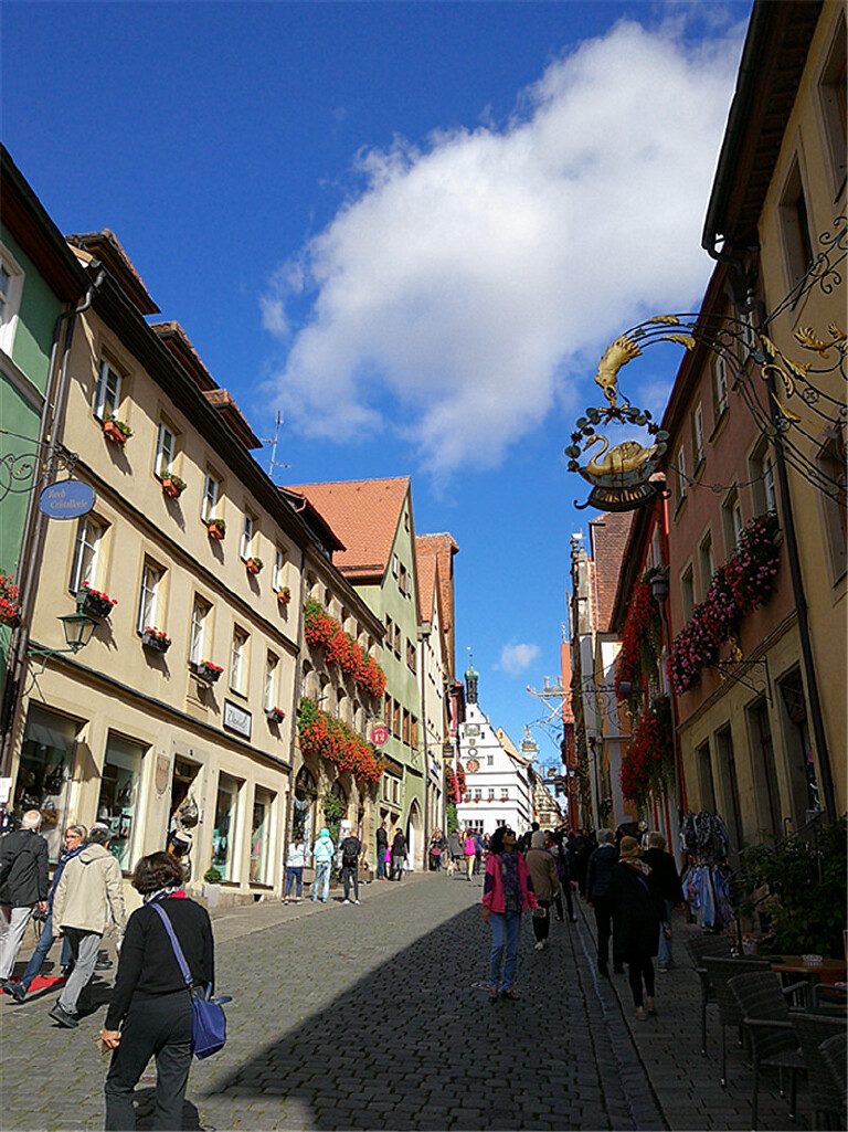 在德国罗腾堡小镇,我们从建于一三八五年的西贝斯塔城门进入小镇,小镇街道都是这种久经岁月磨砺的方石路面,小路两边是美丽的传统木框架房子,还有一个小小的喷泉,顺着街道就到集市广场。集市广场是罗腾堡老城里最热闹的地方,市政厅、议会厅、还有“豪饮钟”都集中在这里。