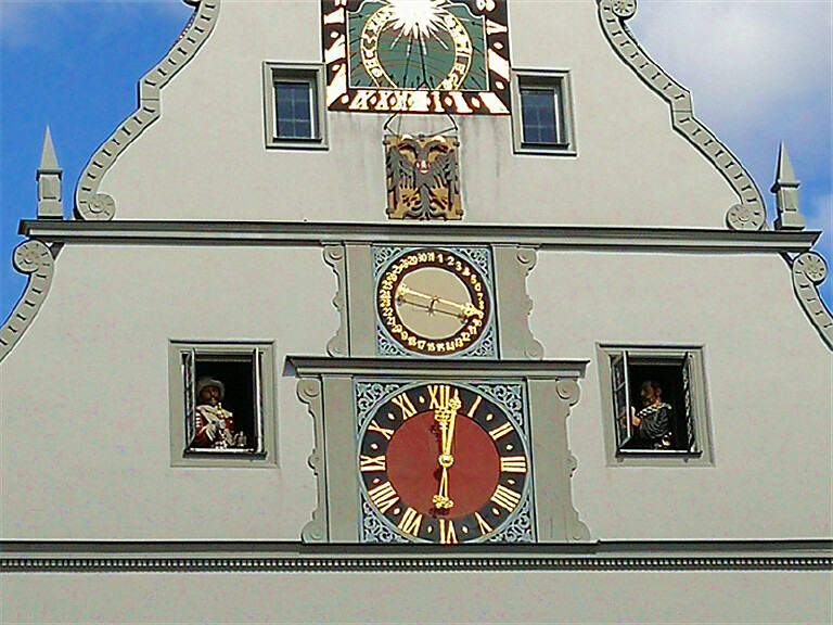 关于豪饮钟,有个传说,1631年,当时神圣罗马帝国日暮西山,各种势力的互相对抗使帝国面临着分崩离析的局面,宗教改革运动引发了新旧教派之间的战争,侵略军想屠杀罗腾堡的议员,并打算毁灭罗滕堡。天主教军团首领蒂利将军发现罗腾堡的葡萄酒很好,有人送上一大杯给将军,将军突发奇想,说如果有人能一口气喝干这一大杯葡萄酒,就不杀人了。于是,市长就一饮而尽,众人得救。现在的议员酒店山墙上的“豪饮钟”仍有蒂利将军和努什市长的木偶,每天都在表演着饮酒救城的故事。从11-15点的整点,钟楼两侧的窗子就会打开,然后将军和是市长就会出现,手拿酒杯的市长会把酒杯中的酒一饮而尽……。