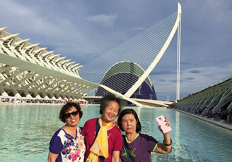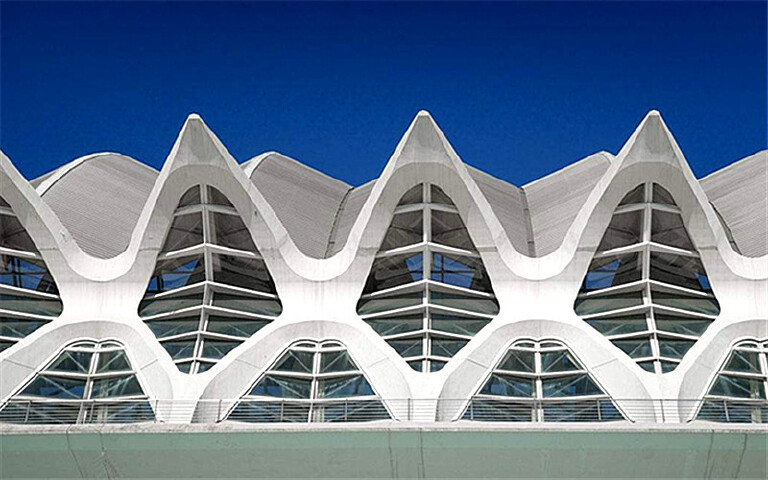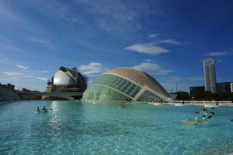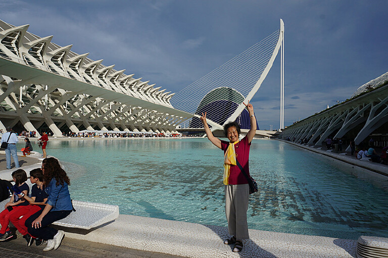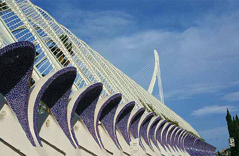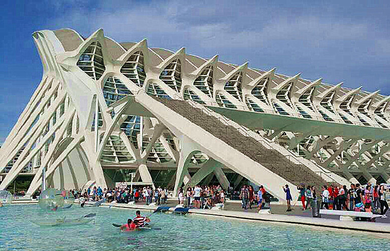 我去过欧洲许多国家,多是看教堂和哥特、巴洛克、罗马、洛可可式古典建筑。西班牙的建筑艺术让人惊叹,除了巴塞罗那高迪的圣家堂、巴特罗公寓、米拉之家和奎尔公园,巴伦西亚的艺术科学城更是让人惊叹不已。它是由三个部分组成的,分别是一个天文馆、一个科学馆菲利佩王子艺术科学宫、一个歌剧院索菲娅王后大剧院。这组造型奇异绝美的建筑,气势磅礴的从北向南一字排开。而大面积的水面设计更是神妙之笔,让这些建筑仿佛是漂浮在海洋中的梦幻之岛。