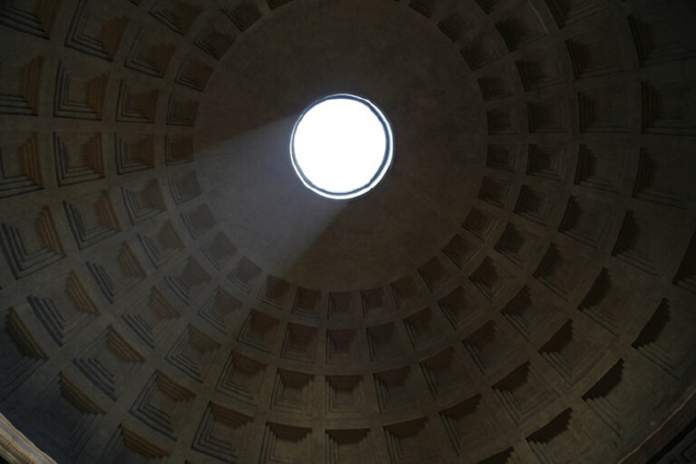 在意大利旅行时,罗马的万神殿建筑也很有特点,穹顶有8米多宽,没有柱子做支撑,阳光透过顶部的圆孔照射进来,也同时起到了计时的作用,当阳光与入口大门垂直时正好是正午时间。