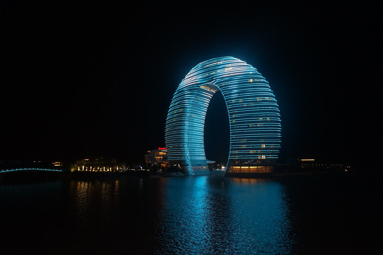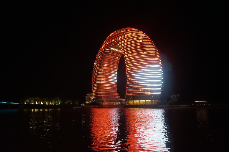 去浙江湖州旅游的时候,我们就特地去了那里的湖州太湖度假区,目的就是去目的太湖喜来登酒店,因为这是国内首家水上白金七星级的酒店,这已经成为了湖州市的标志性建筑。喜来登酒店外形形似月亮,被称为“月亮酒店”,但是更多的网友它为“马桶盖”,白天似乎平平无奇,但是到了夜晚,它就会绽放出它的迷人之处。夜晚的湖州喜来登甚是迷人,此时太湖沿岸的游客数量剧增,大家都是来欣赏夜晚的喜来登酒店,“马桶盖”外墙上的灯光已经开启,时而黄时而蓝,很多游客都被这份美景所吸引。有些即将结婚的新人还会选择这里拍摄婚纱照,可见这的风景颇具特色。土豪朋友们可以选择在月亮酒店住一晚,享受白金7星级酒店的服务。