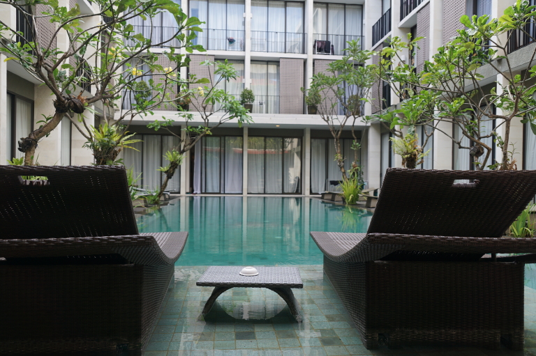 基本上没有这方面的冲突。在旅行中,唯美食与美景不可负。所以出发前必要的功课还是要做的。就拿8月份跟孩子和她同学一起去巴厘岛为例。酒店是提前订好的。要有特色,价格适中。图一是我们在巴厘岛第一晚住的露台酒店。怎么样,还不错吧?