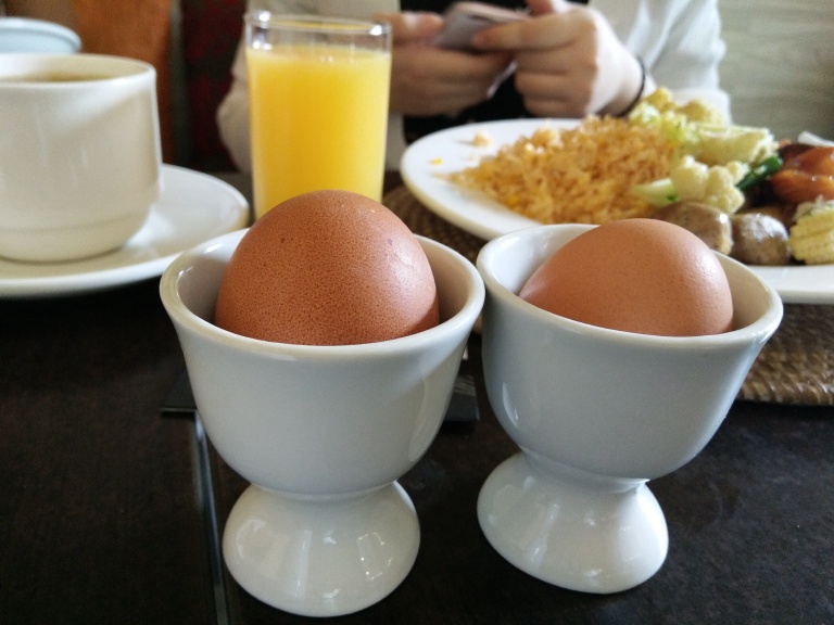 图二图三图四图五是我们第一天的早餐。热情的服务员指着墙上的图示告诉我们,每人可以吃2个鸡蛋,但是只能选一种做法。我选的是煎荷包蛋(图二)。想尝尝印尼风味的煎蛋,结果不出所料,就像在柬埔寨一样,当地人喜欢蛋黄有些稀的。这很适合我的口味。孩子和她同学喜欢把鸡蛋和切碎的蔬菜混合后煎成蛋饼(图三)。夫人喜欢吃白水煮蛋(图四)。但吃的时候要沾点酱油。