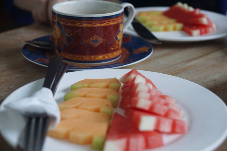 在乌布的时候,早餐是店员烤制的吐司,自己加黄油,佐餐的是咖啡和水果(图五)。巴厘岛的咖啡真心不错,醇厚芳香。巴厘岛的果汁也非常棒,差不多每餐必点。因为印尼的饭菜偏辣,正好可以调剂一下口味。