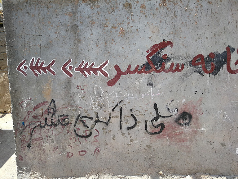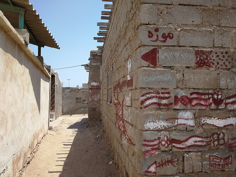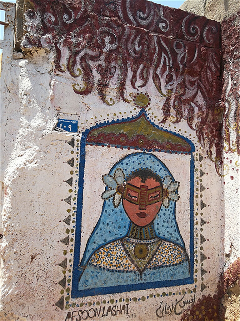 在伊朗的霍尔木兹岛旅行时,中午去司机家吃饭。当地的房子和街道墙上的文字图案把我深深吸引,走着走着一抬头,糟糕!他们拐进那个门啦?