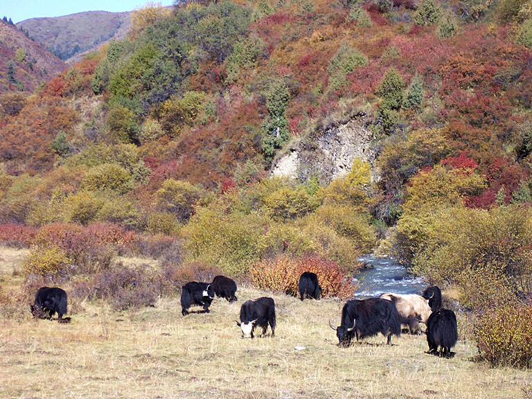 我最喜欢秋天,因为色彩,秋天有最绚丽五彩斑斓的色彩。刚退休时我们自驾去阿坝,9月底的卡龙沟、奶子沟、壤塘秋色渐浓,绿色、黄色、红色加上色彩鲜艳的藏房和经幡,妙不可言。第二年9月中自驾去若尔盖、唐克、红原,草已经黄了,蓝天白云下雪白的羊群,黑色牦牛群,还有雪白的藏房和远处的雪山,构成了一幅美丽的画卷。