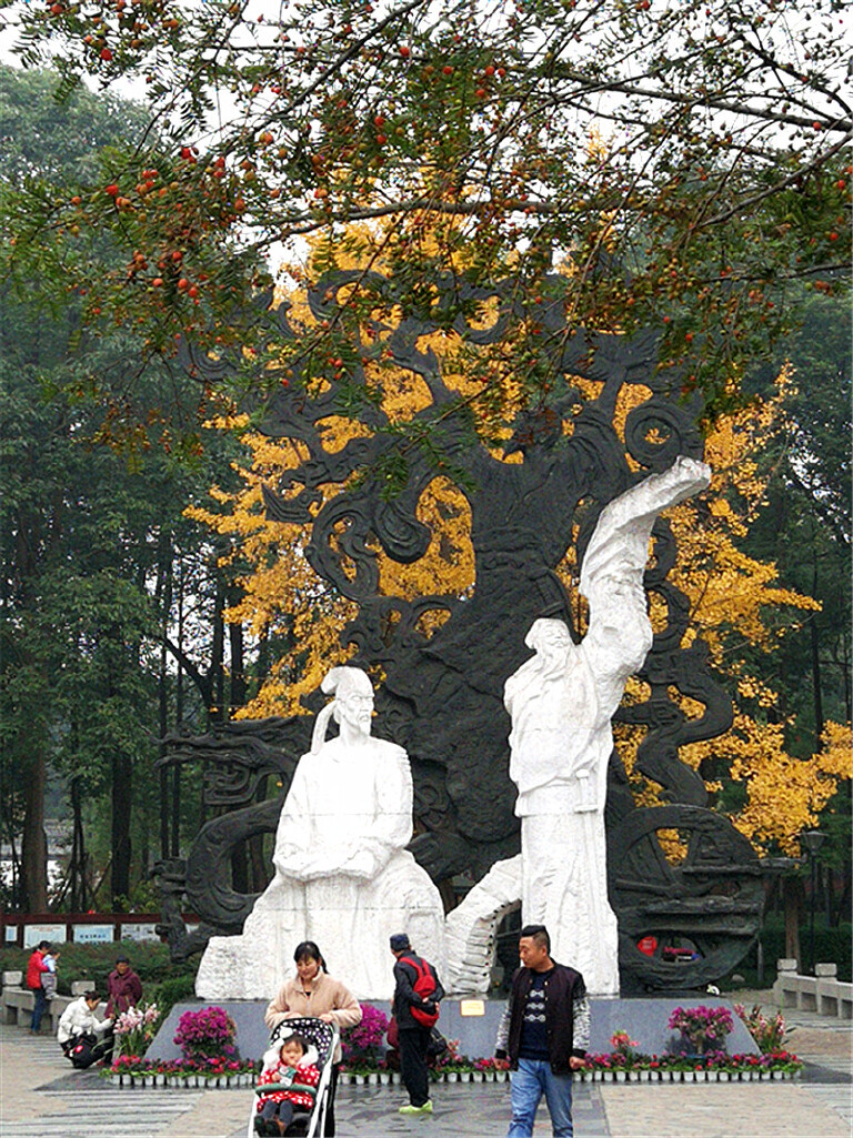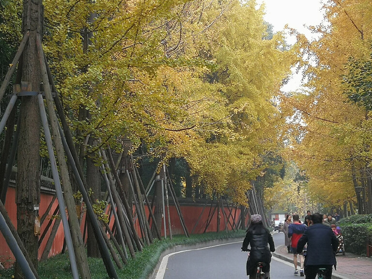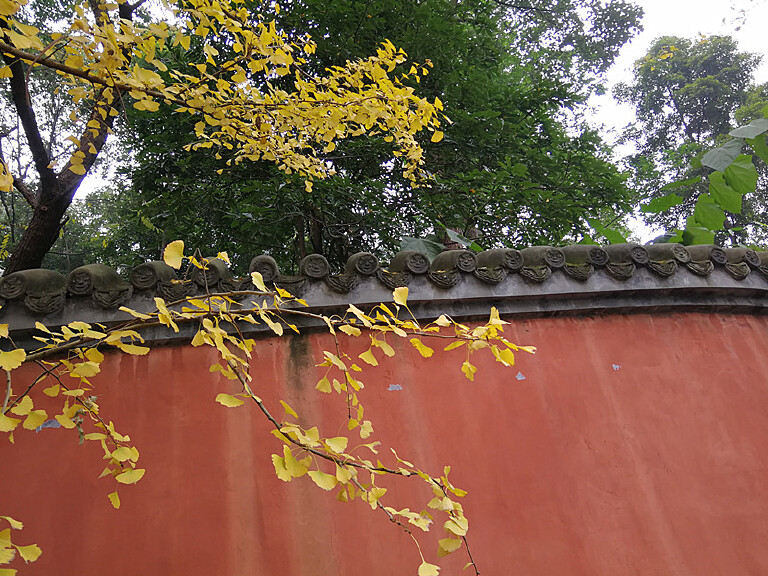 成都的秋天来的比较晚,尤其是等成都的银杏叶黄枫树叶红,得到11月底12月初了,这时已是成都的深秋。我家旁边的浣花溪公园内银杏金灿灿美不胜收,诗歌大道尽头金黄的银杏衬托着李白杜甫(白色)屈原(黑色)塑像;公园紧邻杜甫草堂,红墙映着金黄银杏一直是我最想拍的镜头,除了颜值极高,还充满浓浓的文化韵味。
