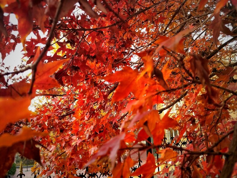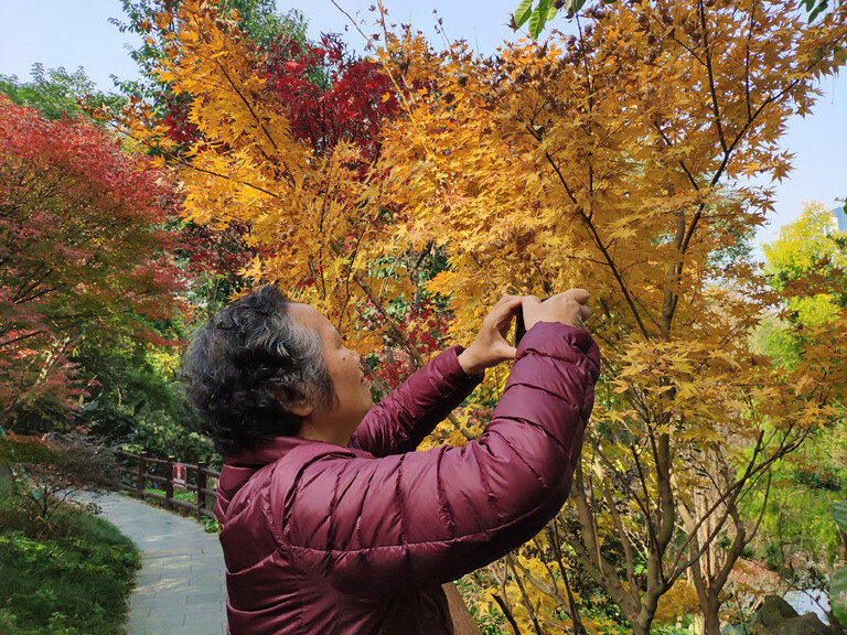 市中心的人民公园,11月底银杏一片金黄,微风吹过,像金色蝴蝶翩翩起舞。枫叶红得似片片彩霞,随风摇曳,飒飒吟唱。黄的金灿,红的热烈,引来众多追逐美、欣赏美、享受美的人们。秋天不会伤感,这个季节有绚丽多彩的美景,有欣赏美景的好心情。