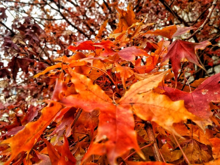 落叶缤纷秋意浓,有时会略带忧伤,让你感到时光匆匆,一切宛如过客一般。曾经看过一篇文章“风、叶子和树的爱情故事”被深深打动,风、叶子和树以自己的方式爱着对方。对于叶子爱的方式大意是:“叶子以自己独有的方式这样爱着树和风,在树上它用自己绿、自己的活力装扮树木的粗枝,给树带来一线生机;在跟着风的时候,给风装饰的是秋的色彩,带有一种飘逸带有一种随和,随风而动……”。透过片片落叶,如果抱着一种美好的心情,去感受那缤纷的色彩、感受蕴藏着的那份爱,或许能冲淡你忧伤的心情。
